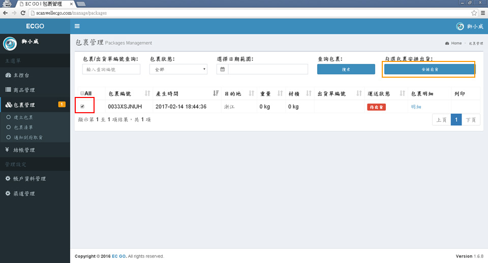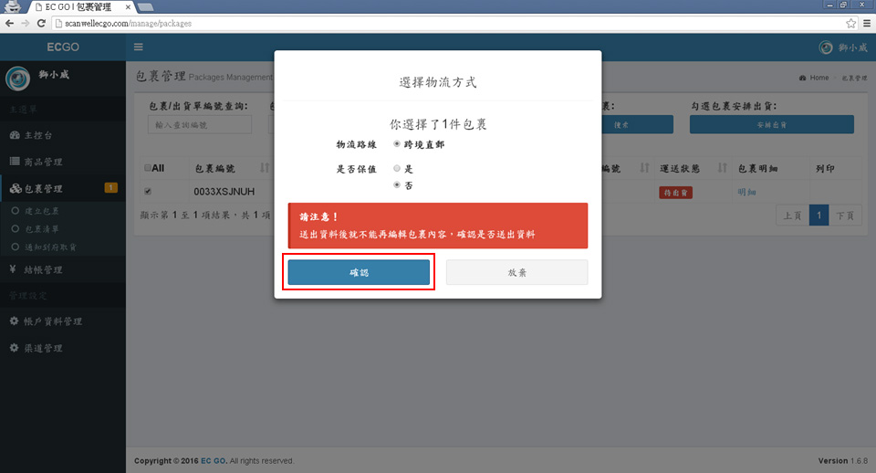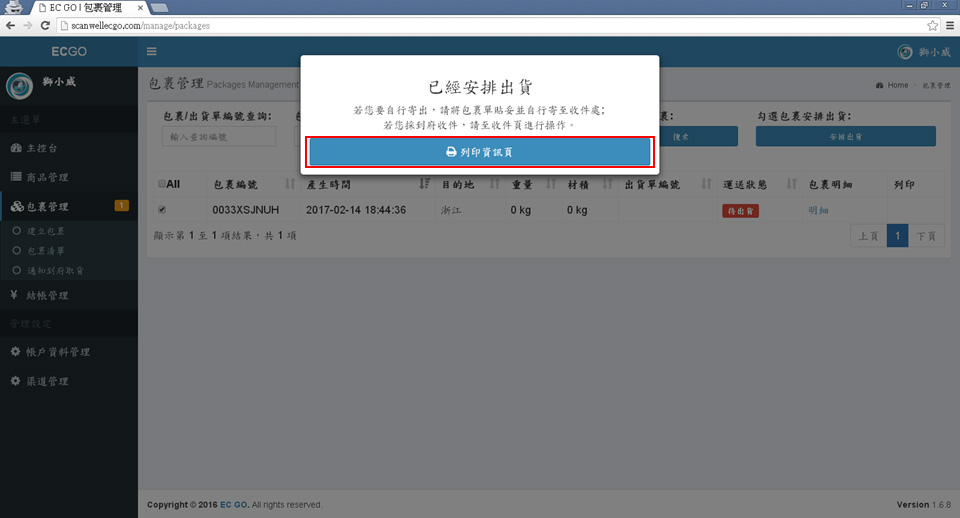 寄出包裹完成作業(若是要提貨,則需操作〝通知到府取貨〞)