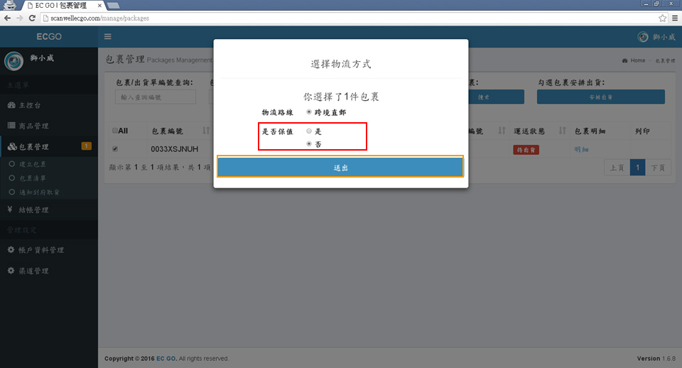 02.選擇是否保值,選擇好按送出(所有圈選商品是否保值都是統一,故若有些包裹需要保值有些不保值時,則分開選取)